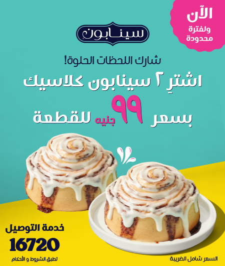 عدد 2 قطعة من العجينة الدافئة المحشوة بقرفه الماكارا الفاخرة ، و مغطاة بفروستينج كريمة الجبنة.، فقط بـ 99 جنيه للقطعة!